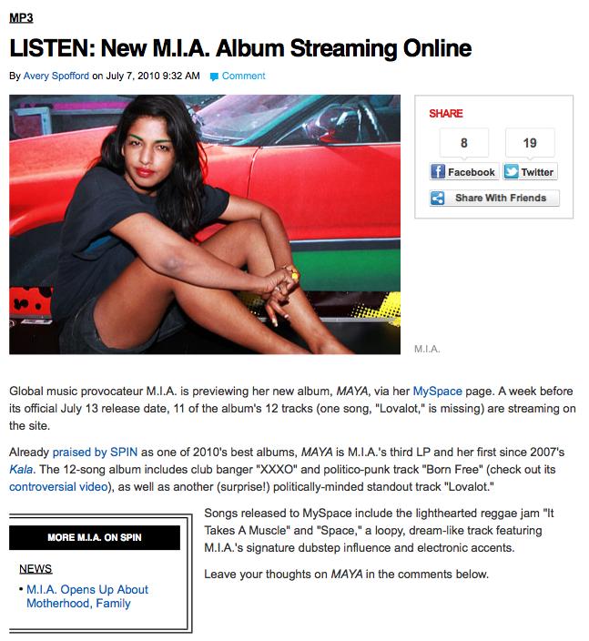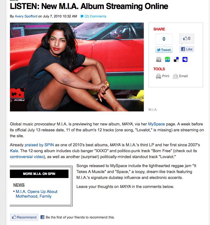 Global music provocateur M.I.A. is previewing her new album, MAYA, via her MySpace page. A week before its official July 13 release date, 11 of the album’s 12 tracks (one song, “Lovalot,” is missing) are streaming on the site.