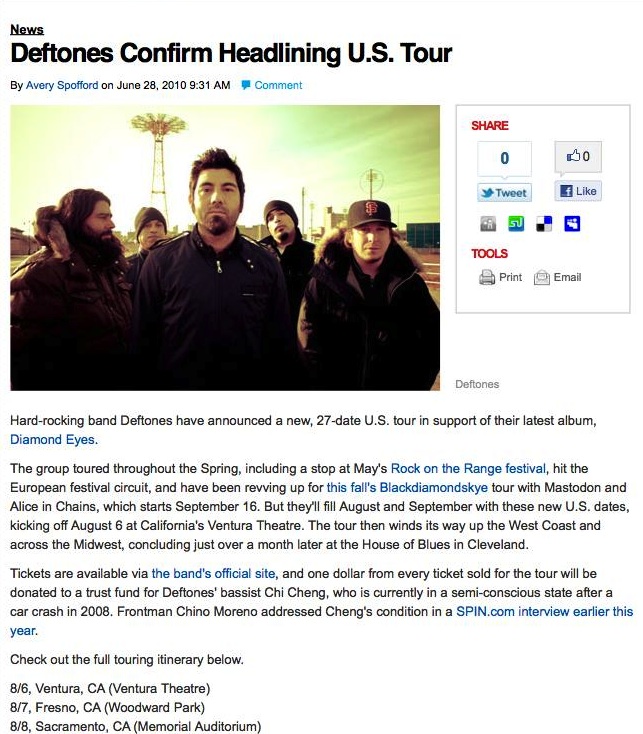 Tickets are available via the band’s official site, and one dollar from every ticket sold for the tour will be donated to a trust fund for Deftones’ bassist Chi Cheng, who is currently in a semi-conscious state after a car crash in 2008. Frontman Chino Moreno addressed Cheng’s condition in a SPIN.com interview earlier this year.