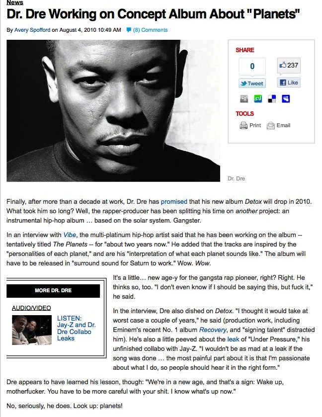 Finally, after more than a decade at work, Dr. Dre has promised that his new album Detox will drop in 2010. What took him so long? Well, the rapper-producer has been splitting his time on another project: an instrumental hip-hop album … based on the solar system. Gangster.