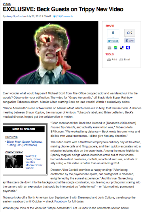 Ever wonder what would happen if Michael Scott from The Office dropped acid and wandered out into the woods? Observe for your edification: The video for “Grape Aerosmith,” off Black Moth Super Rainbow songwriter Tobacco’s album, Maniac Meat, starring Beck on lead vocals! Watch it exclusively below.