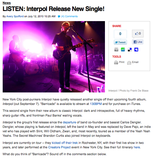 New York City post-punkers Interpol have quietly released another single off their upcoming fourth album, Interpol (out September 7). “Barricade” is available to stream at 130BPM and for purchase on iTunes.