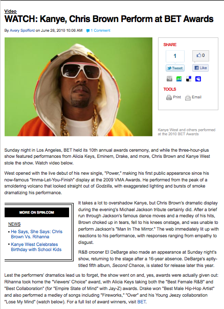 Sunday night in Los Angeles, BET held its 10th annual awards ceremony, and while the three-hour-plus show featured performances from Alicia Keys, Eminem, Drake, and more, Chris Brown and Kanye West stole the show. Watch video below.