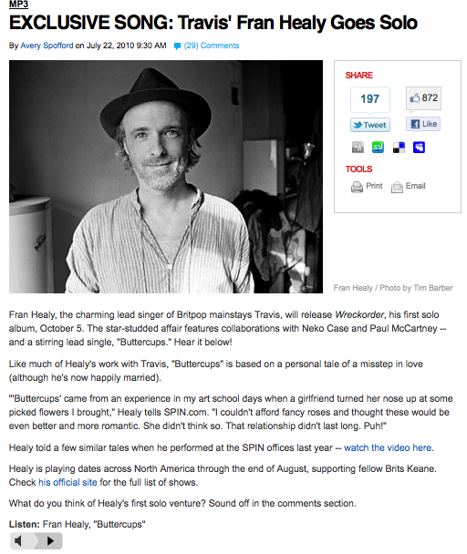 Fran Healy, the charming lead singer of Britpop mainstay Travis, will release Wreckorder, his first solo album, October 5. The star-studded affair features collaborations with Neko Case and Paul McCartney — and a stirring lead single, “Buttercups.” Hear it below!