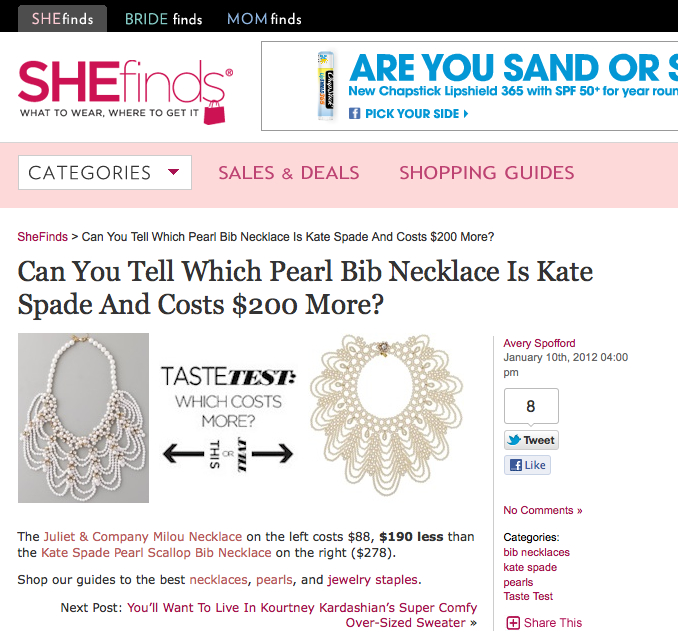 SHEfinds.com Taste Test: Can You Tell Which Pearl Bib Necklace Is Kate Spade And Costs $200 More? All rights to SHEfinds.com Share this: Email a link to a friend (Opens in new window) Email Share on Facebook (Opens in new window) Facebook Share on X (Opens in new window) X Like Loading... Related